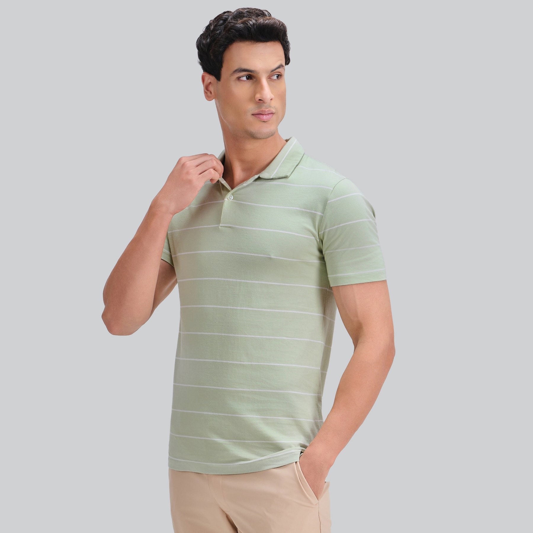 Say Say hello to our pistachio green Linea striped polo - a classic upgrade for your wardrobe.